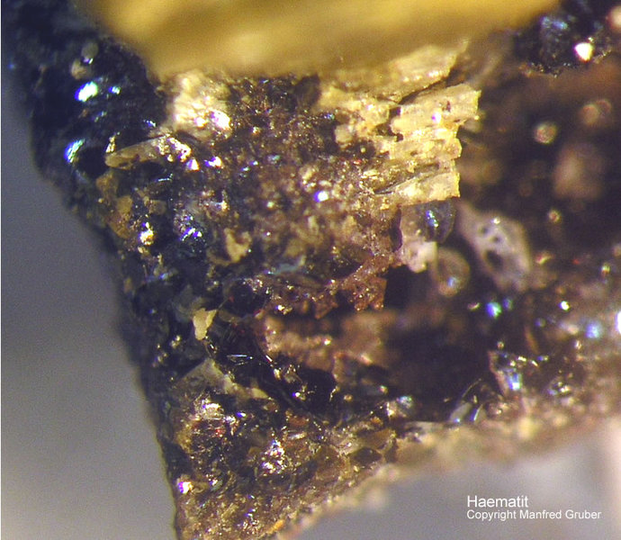 Galeriebilder - H (Haematit - Farbe schwarz, dünne Kristalle blutrot,manchmal mit Anlauffarben - Mohshärte 5 - 6)